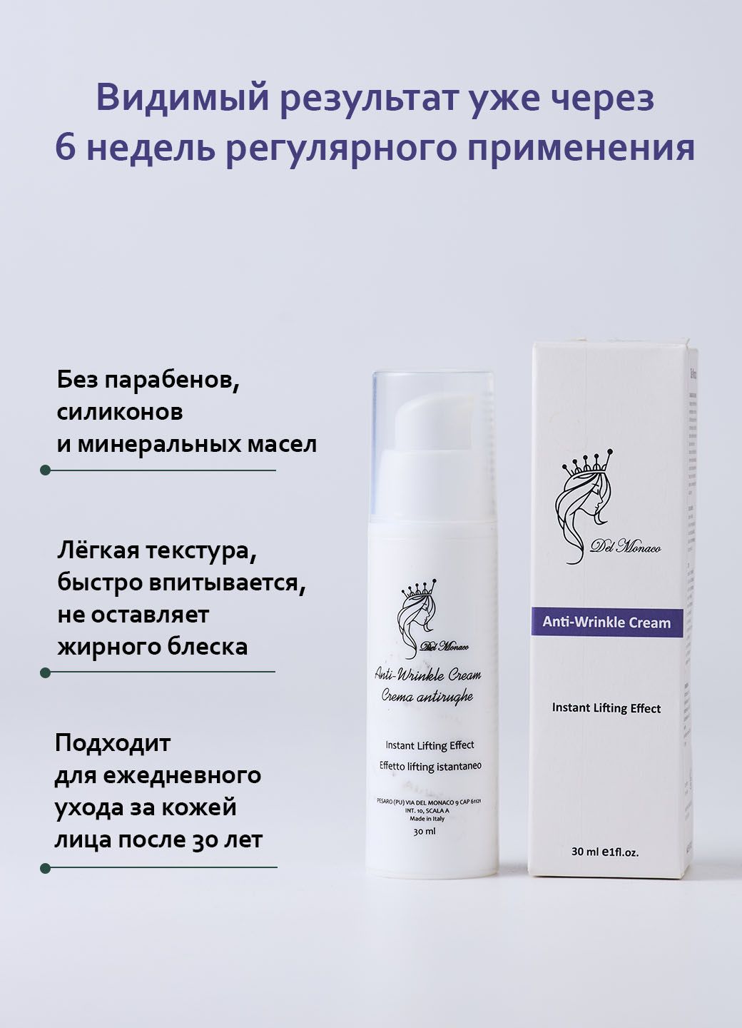 Для видимого результата — подтянутой, упругой кожи и разглаженных морщин — применяйте крем регулярно в течение 6 недель и дольше.