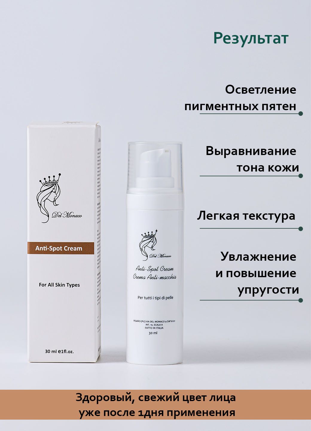 Del Monaco Anti Spot — уход для постепенного осветления пигментации и восстановления ровного, сияющего тона кожи.